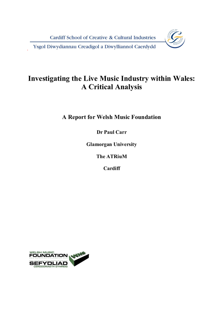 This report is the result of a grant application awarded by The Welsh Music Foundation, who were given the money by The Welsh Assembly Government. Its purpose was to investigate pertinent issues of the live music industry that resonate within Wales. Research methodology included the implementation of an online questionnaire targeted toward the Welsh music industry, closely followed by a range of face to face interviews with key industry personnel.